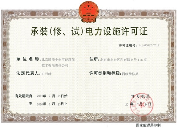 7月24日,經國家能源局華北監管局批準,北京國能中電節能環保技術有限責任公司獲得電力設施承修類資質(四級),許可證有效期6年。國能中電會不斷開拓電力承修方面的業務,為客戶提供更優質的服務。